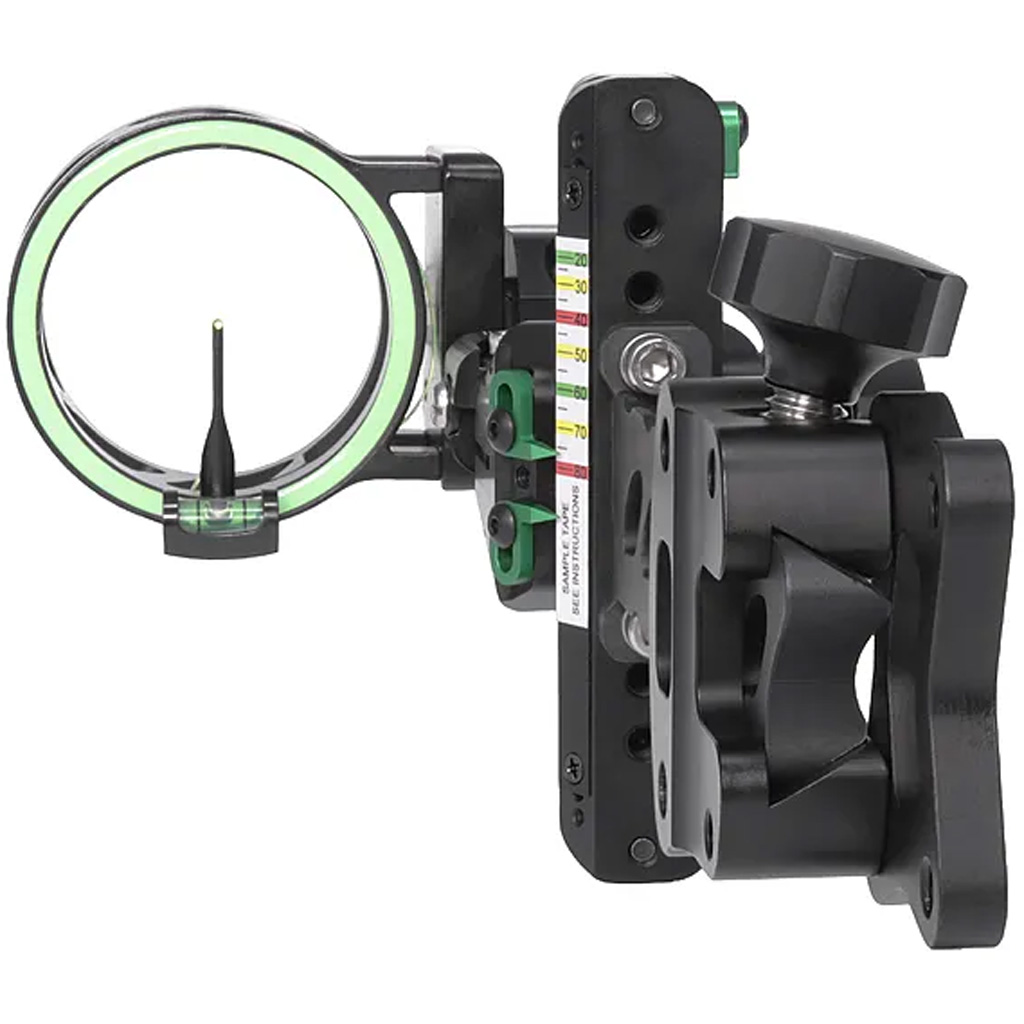 1.8” ID aperture with a bright single (1) 0.19” vertical pin. Micro adjustable windage adjustment. Adjustable for left and right-handed users. Glow ring illuminates fixed level. Fixed bracket with 3 mounting positions