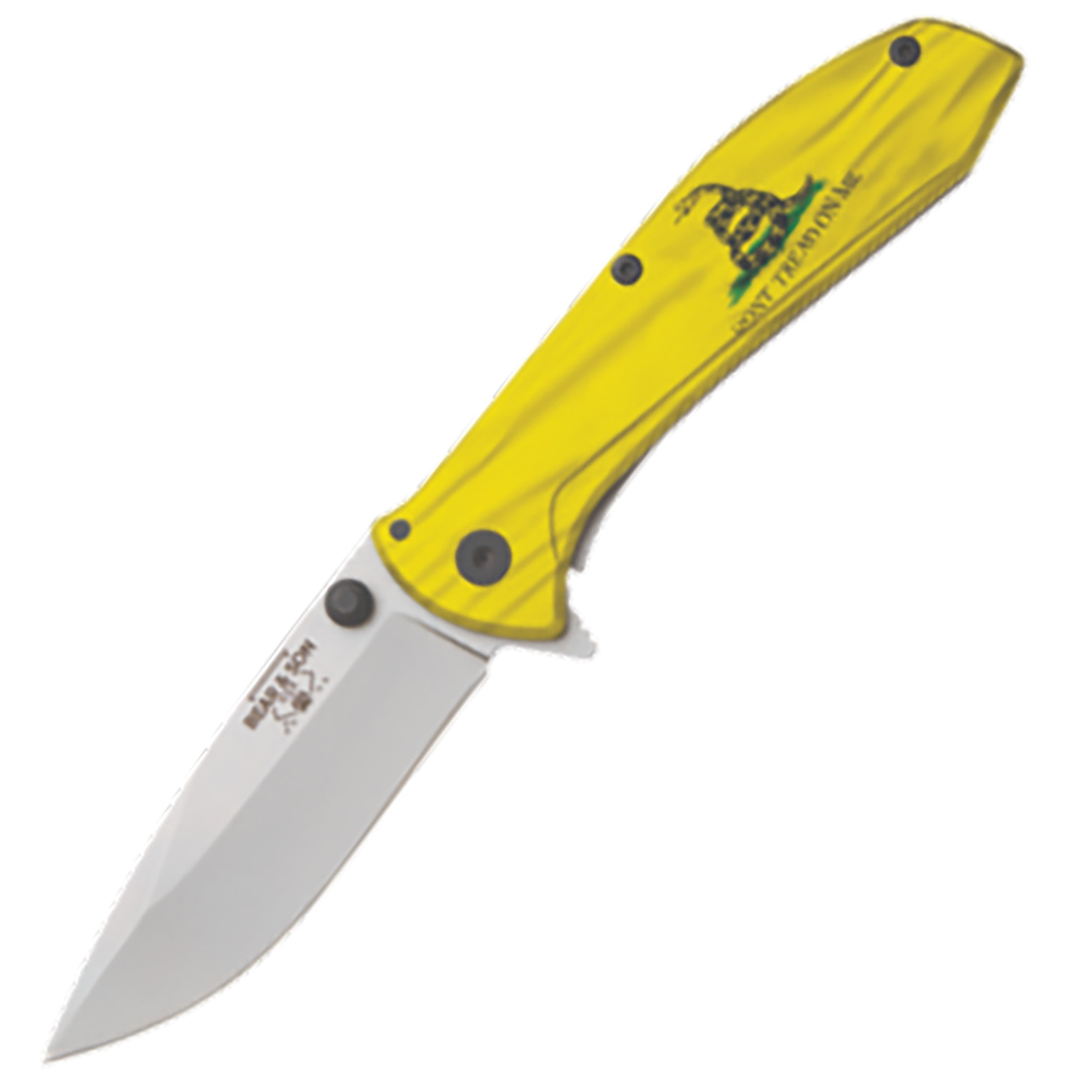 BEAR & SON UV ART GADSEN FLAG 4″ STN/YLW 4″ STAINLESS STEEL FRAMELOCK ASSISTED OPENER- GADSDEN FLAG BEAR OPS – Made in the USA with USA manufactured parts, Materials and Workforce.