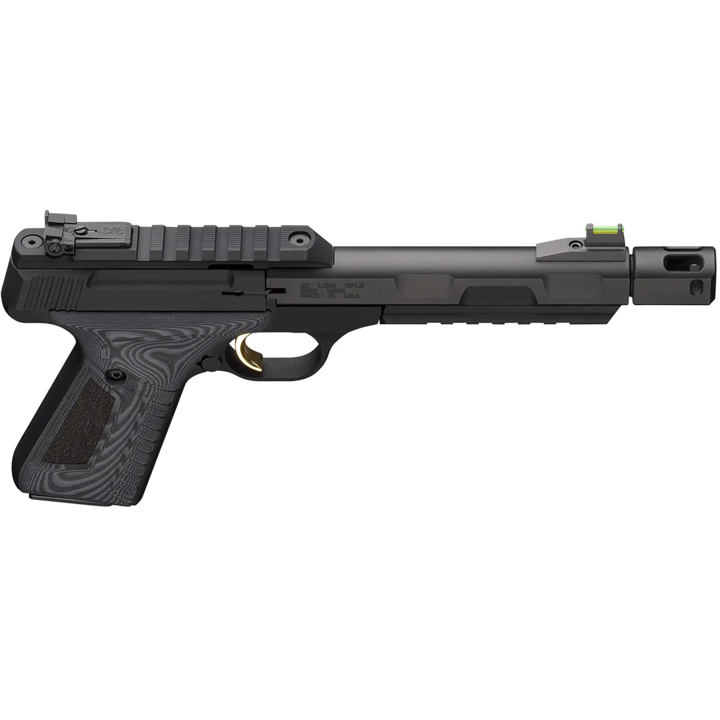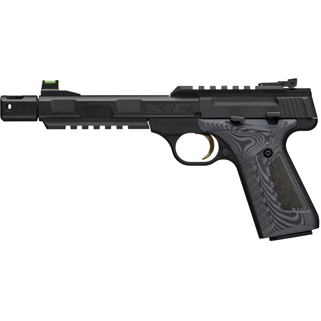 The Browning Buck Mark Contour Pro with a 4.4-inch barrel is a compact and precise rimfire pistol ideal for both competition and casual shooting. Chambered in .22 LR, it features a matte blued steel barrel threaded 1/2×28 and includes a removable compensator to reduce recoil and improve follow-up accuracy. This model includes a TRUGLO fiber-optic front sight and Pro-Target adjustable rear sight, along with dual Picatinny rails for optics and accessories. The black aluminum alloy frame is paired with gray/black G-10 grips and a gold-plated trigger for enhanced control and style. With a 10-round capacity and included pistol rug, this pistol offers balanced performance and premium features in a compact package.