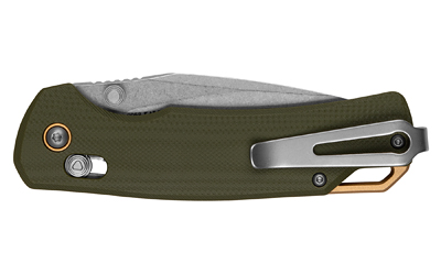 Slightly larger than typical EDC folders, the Proximal raises everyday carry to the next level of precision and control. Its contoured olive G10 handle fits comfortably in hand, paired with gold-anodized aluminum accents for a clean, modern look. A stonewashedD2 blade delivers reliable edge retention and cutting performance with a versatile drop-point shape. The secure DuraLock mechanism keeps fingers safely clear of the blade path and allows smooth, one-handed operation with the thumb studs. Tuned with KVT ball bearings and weight-relieved liners for balance, the Proximal is built for confident performance and everyday use.