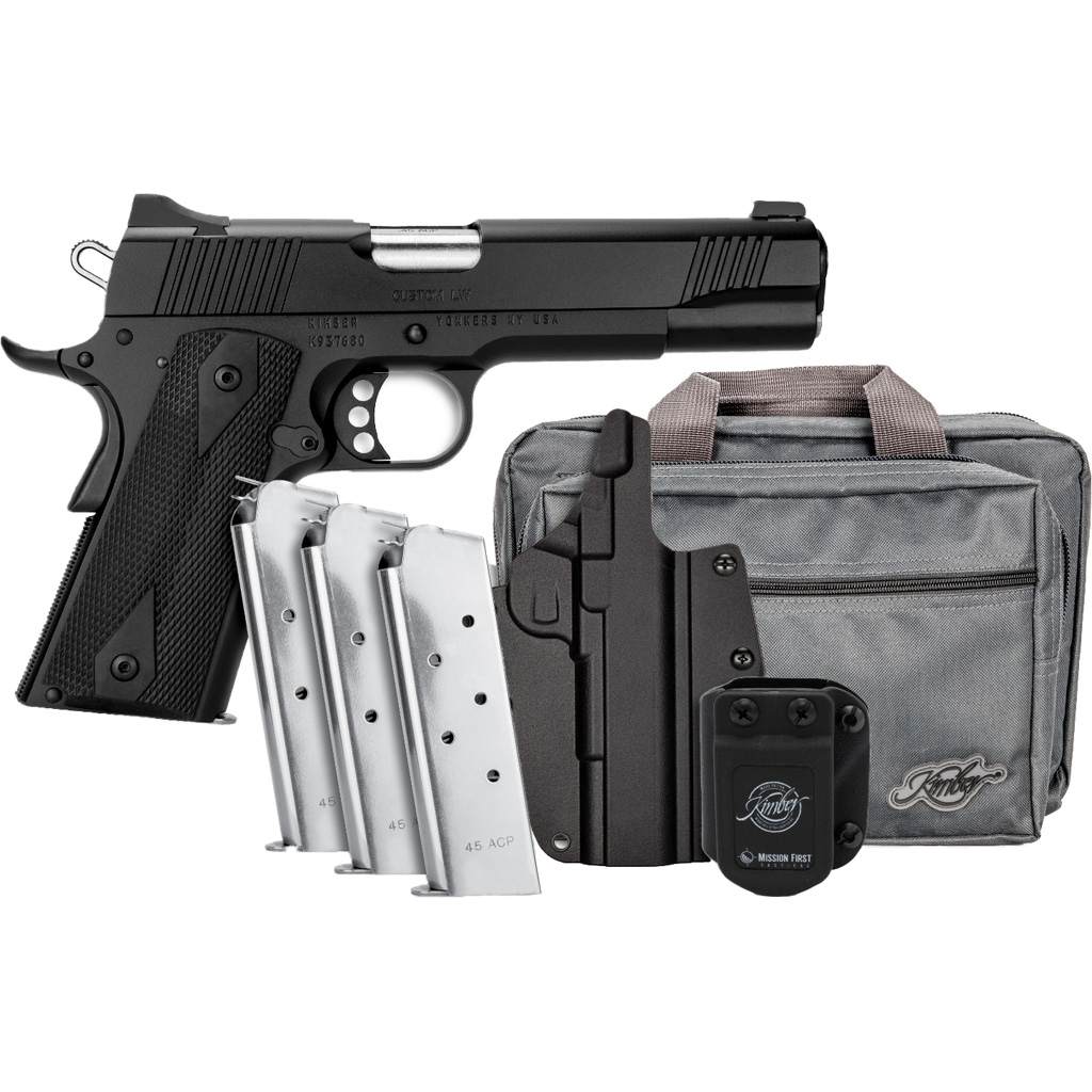 Elevate your range experience with the Kimber Custom LW TFS Pistol Bundle, a comprehensive package for the shooting enthusiast. This bundle features a .45 ACP Kimber Custom LW pistol with a 5-inch match-grade stainless steel barrel, KimPro black finish, and white dot sights for precise shooting. The lightweight aluminum frame and a 3-hole black aluminum trigger ensure ease of handling and a clean 4-5 pound trigger pull. Included are three 7-round magazines, a Mission First Tactical holster, magazine carriers, and a Kimber Range bag, rounding off a collection that offers great value.