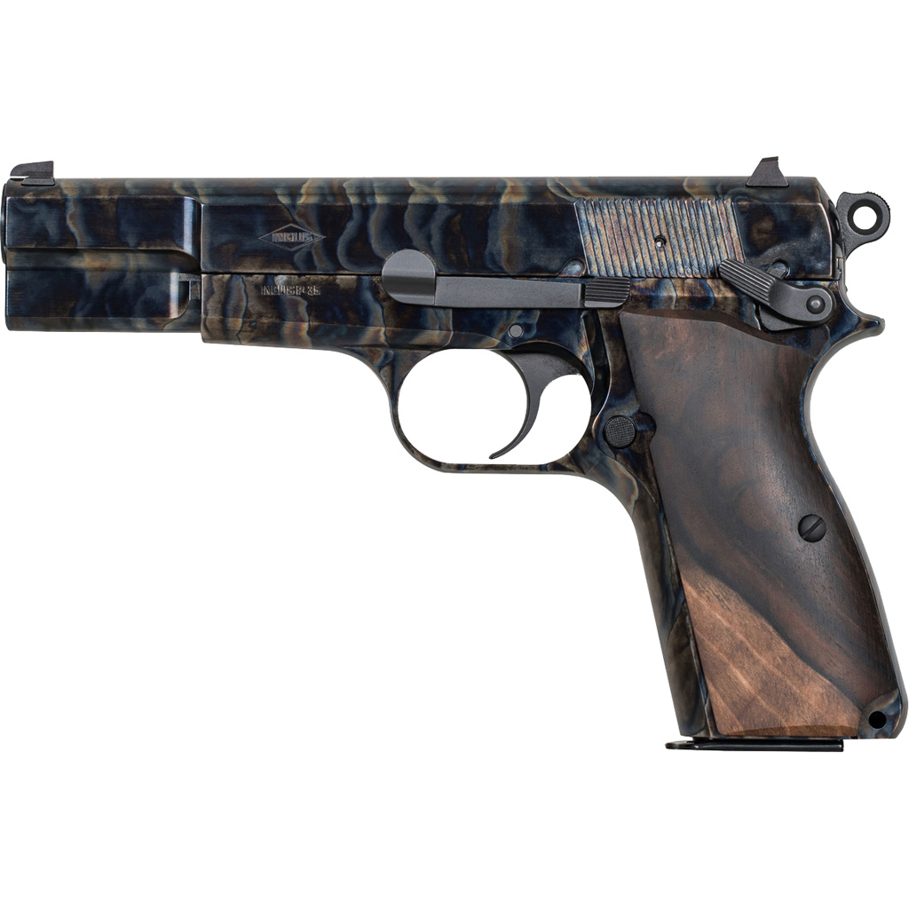 The MAC Inglis GP-35 Pistol features a 4.7-inch button-rifled barrel made from 4140 forged and machined steel with a hard chrome finish for durability and precision. The pistol’s frame and slide are also forged from 4140 carbon steel, and it boasts a unique color case-hardened finish. Grade III Turkish walnut grips enhance its ergonomics and the shooting experience is refined with a smooth, 7-pound trigger pull. A brass bead front sight and black U notch rear sight, both in Browning dovetail patterns, provide classic aesthetics and functional sighting. Each Inglis GP-35 comes complete with a polymer lockable hard case, two magazines, a cleaning kit, a trigger lock, and an instruction manual, ensuring that you have everything needed for maintenance and secure storage.