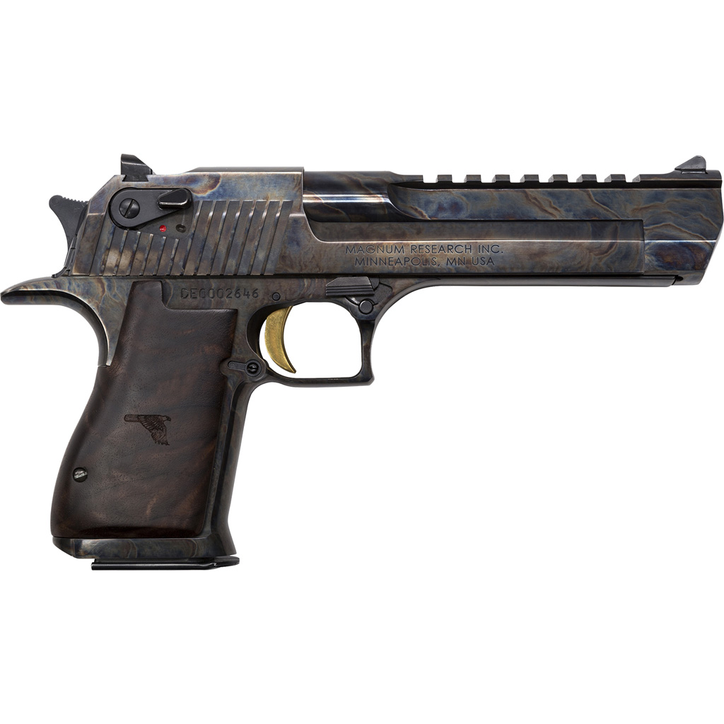 The Mark XIX Desert Eagle is a gas-operated, semi-automatic pistol that holds a 7 round capacity and measures 10.75” in length with a 6 inch barrel available in a case hardened finish. The width is 1.25”, height is 6.25” and the weight with an empty magazine is approximately 72 ounces. It has a trigger reach of 2.75” and a sight radius of 8.5” with the 6 inch barrel. The construction of the Mark XIX utilizes CNC machine technology providing specifications with tight tolerances. The grip is anatomically formed and provides an ideal hand seating angle for two-handed shooting allowing for comfortable firing. The picatinny style accessory rail allows for aftermarket optics and scope rings.
