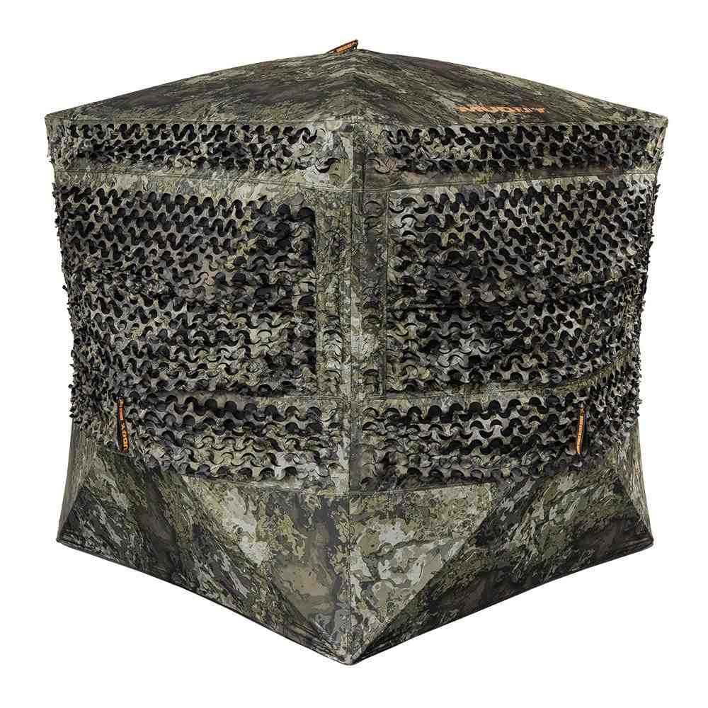The prime benefit to using Muddy’s newest ground blinds this season? Pure carnage. With its exciting new die-cut fabric the three-person Carnage Die Cut Ground Blind blends seamlessly into its surroundings successfully breaking up the outline and resulting in one incredibly deadly hunting hideaway. The blind’s 180° panoramic shooting window delivers a wide field of view conducive to taking advantage of most shooting opportunities. its self-fabric and one-way see-through Evo Mesh sliding curtains provide an added layer of concealment ensuring hunters can always see out while preventing game from ever seeing in. The main gunport and two bow-hunting windows improve visibility even more allowing you to keep a close eye on your surroundings from nearly every angle. Inside the easy-access V-shaped zippered door hunters will find gear straps two upper ozone loft pockets and one large mesh storage pocket perfect for stowing and organizing must-have gear.