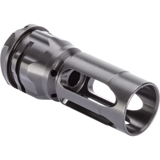 The Spike’s Tactical Dynacomp is designed to reduce recoil impulse and muzzle climb to provide faster follow up shots. The Dynacomp accomplishes this by balancing the direction of the blast along the vertical (upward) and perpendicular planes of the muzzle to lower muzzle rise. The ports on the Dynacomp are ball dimpled for smooth expansion of gases and rapid heat dissipation. The front of the device is 0.25″ thick to better handle the abuse of full auto fire.