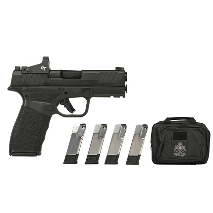 Springfield Hellcat Pro 9mm 3.7″ Black gu25 Black polymer frame & grip, CT-1500 Red Dot Optic; Tritium/Luminescent Front Sights; Tactical Rack U Notch Rear Sights 5x10rd mags; Range Bag