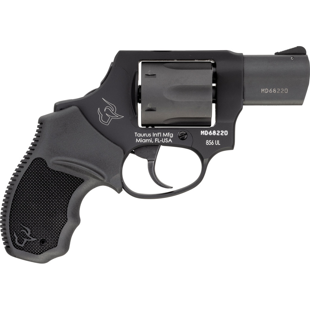 The Taurus 856 is a lightweight and easily concealable 6-shot revolver with a small frame and 2” barrel. This special concealed hammer version prevents snags and increases concealability. Chambered for .38 Special cartridges, this compact, concealed carry pistol is assembled with a lightweight aluminum frame, the Ultralite model has an overall weight of 15.7 ounces. This 856 features and a double/single action for fast and accurate follow-up shots. Designed for concealed carry, this revolver provides accuracy in a lightweight and comfortable package. This model has a matte black finish.
