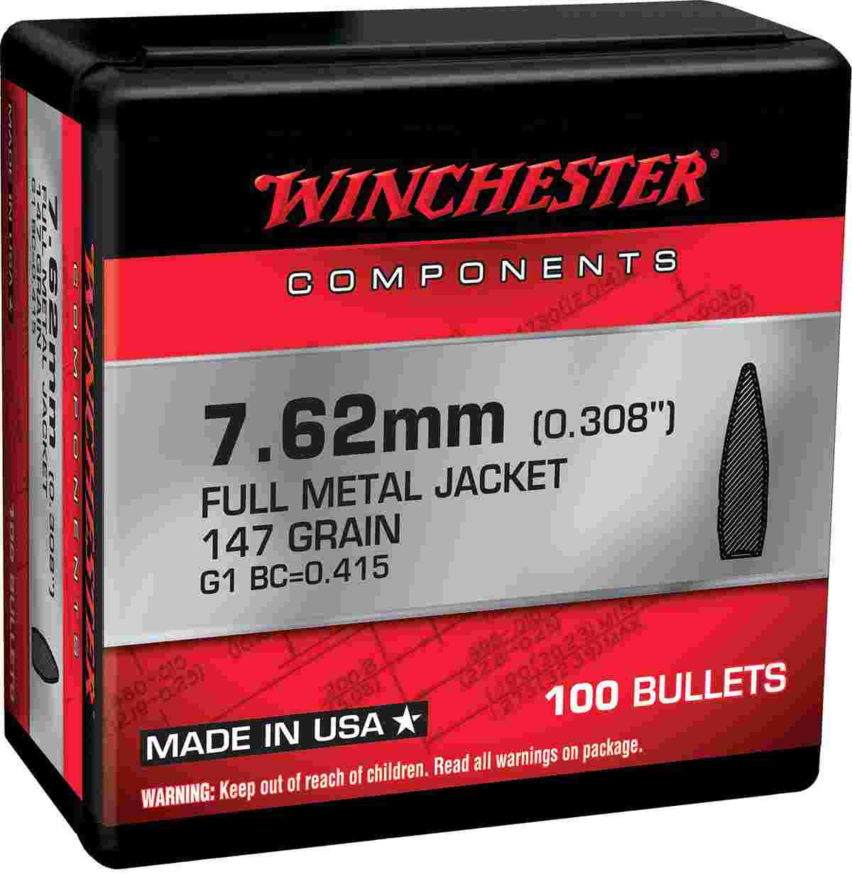 Winchester FMJBT Bullets 7.62mm .308″ 147gr 100/ct