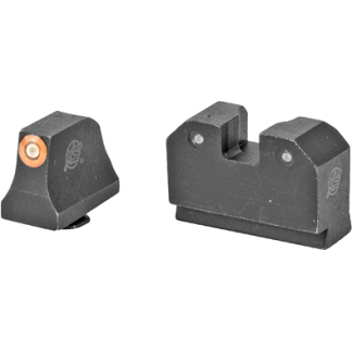 XS R3D Night Sights feature a traditional 3-dot tritium, notch and post sight picture. The blacked out rear increases contrast against the front sight. Available in orange or green, the front sight ring is equipped with their Ember Glow Dot Technology which absorbs ambient light and glows in low light. R3D sights are the brightest options for fast and accurate shooting in bright and low light. Green is the best option for low light and has the brightest glow intensity. Orange contrasts the best in bright light settings while still maintains visibility in low light. The front sight tritium lamp is brighter than the 2 rear sight lamps, reducing the possibility of mixing up the front sight tritium vial with a rear sight vial in low/no light. The front blade measures 0.145″ (3.68 mm) wide, and the rear notch is 0.170″ (4.32 mm) wide, which increases the visibility of the front sight. R3D sights are installable by sight pusher tools or by using a hammer and punch. Might require filing rear sight to fit. Fits Glock models 43X & 48.