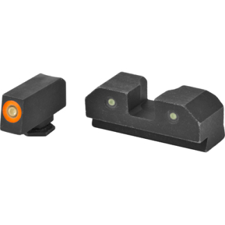 XS R3D Night Sights feature a traditional 3-dot tritium, notch and post sight picture. The blacked-out rear increases contrast against the front sight. The front sight is available in orange or green and is equipped with Ember(R) Glow Dot Technology. Ember absorbs ambient light and glows in low light. The front tritium lamp charges the Ember dot making the front sight glow brighter than the rear at all times, keeping focus downrange. R3D sights are the brightest notch and post option for fast and accurate shooting in bright and low light.